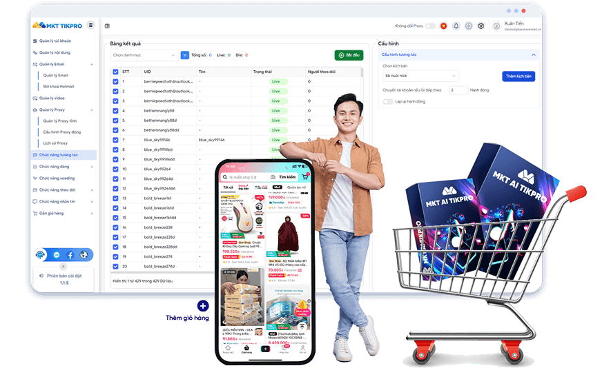Phần mềm MKT Tikpro là một công cụ cho phép bạn quản lý và tự động không giới hạn tài khoản tiktok. Qua đó, hỗ trợ tối đa trong việc kinh doanh trên tikok hiện nay. Với MKT Tikpro, việc seeding, tăng follow, viral thương hiệu , sản phẩm của bạn sẽ trở nên vô cùng đơn giản và nhanh chóng.
